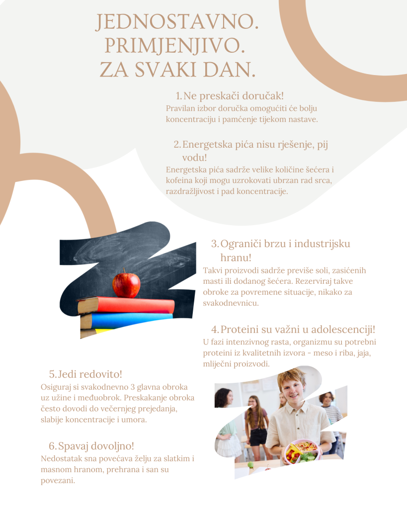 Adolescencija je razdoblje intenzivnog rasta i razvoja. Organizam tada ima povećane potrebe za energijom i zaštitnim nutrijentima, a prehrambene navike koje se oblikuju u toj dobi često ostaju prisutne kroz cijeli život. Upravo zato, školska užina ne bi smjela biti samo brz i praktičan izbor, već nutritivno vrijedan obrok koji doprinosi boljoj koncentraciji, stabilnoj razini energije i općem zdravlju.