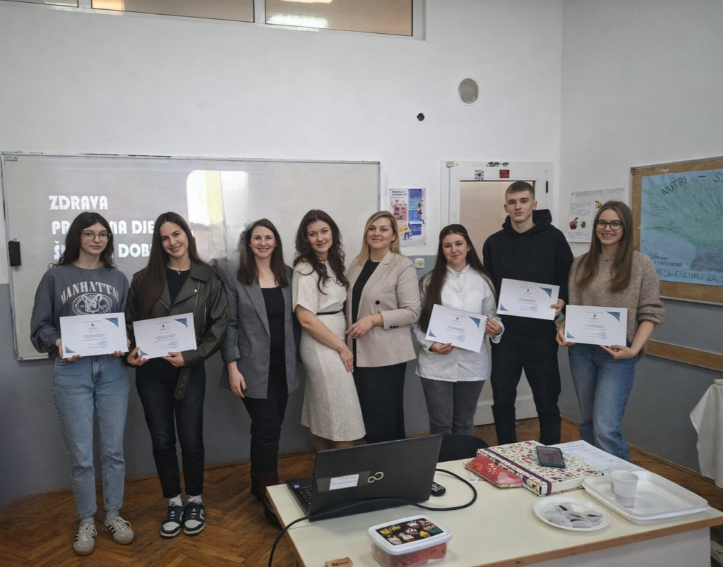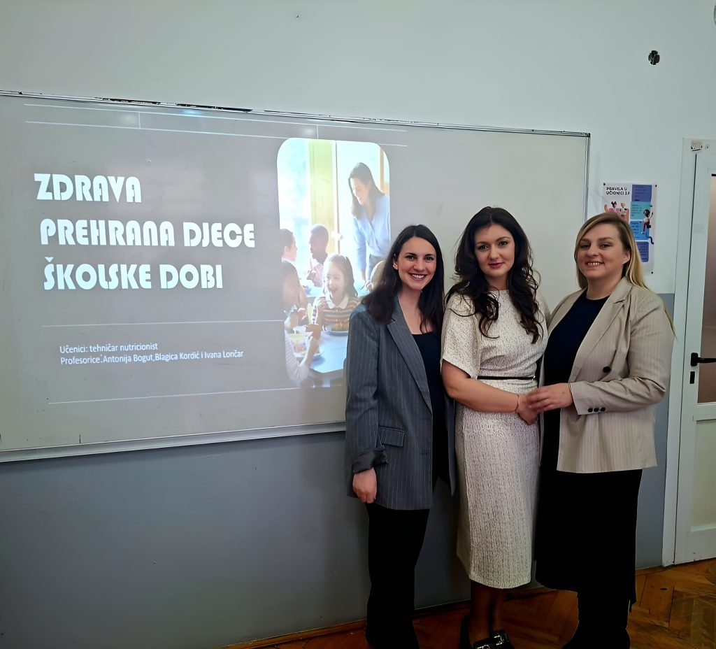 U našoj školi uspješno je završen ciklus radionica o pravilnoj prehrani adolescenata, s naglaskom na važnost zdrave školske užine. Posebno nas veseli što su nastavnice Osnovne škole Antuna Branka Šimića Mostar zajedno sa svojim učenicima, prepoznale važnost teme i aktivno sudjelovale u završnoj radionici. Njihov interes potvrđuje koliko je edukacija o prehrani danas potrebna.
